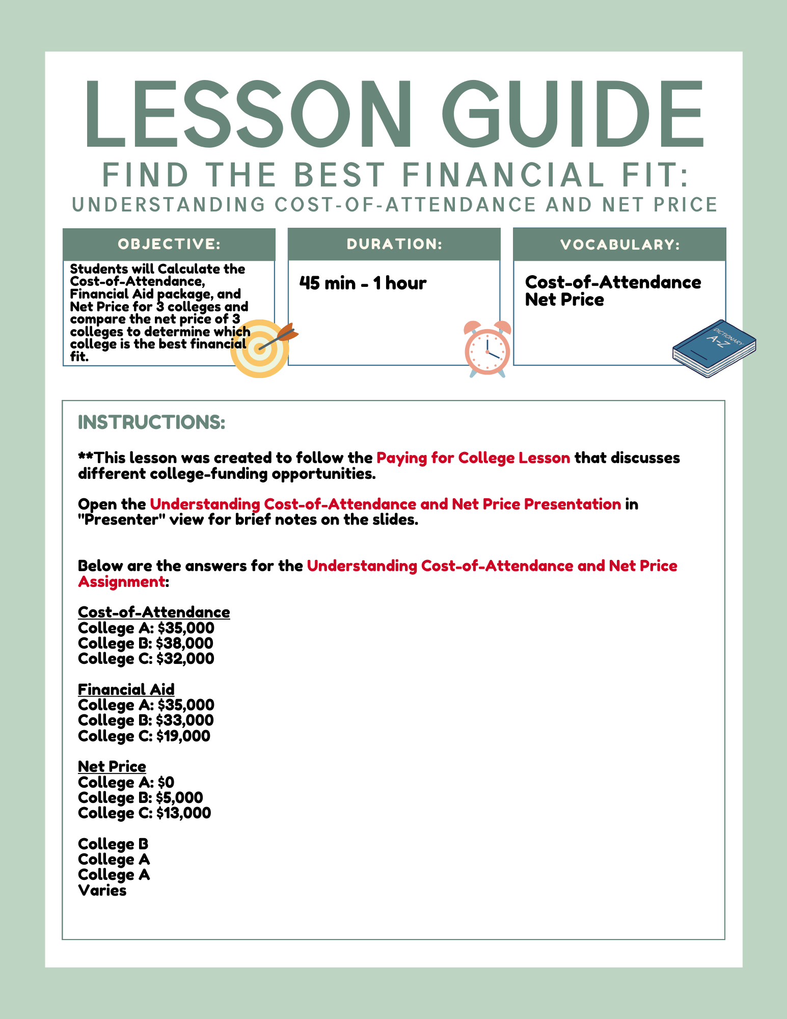 FINDING YOUR BEST FINANCIAL FIT: Understanding Cost-of-Attendance and Net Price UNDERSTANDING COA AND NET PRICE(View in Presenter Mode for Presentation notes) UNDERSTANDING COA AND NET PRICE ASSIGNMENT UNDERSTANDING COA AND NET PRICE LESSON GUIDE UNDERSTANDING COA AND NET PRICE HANDOUT